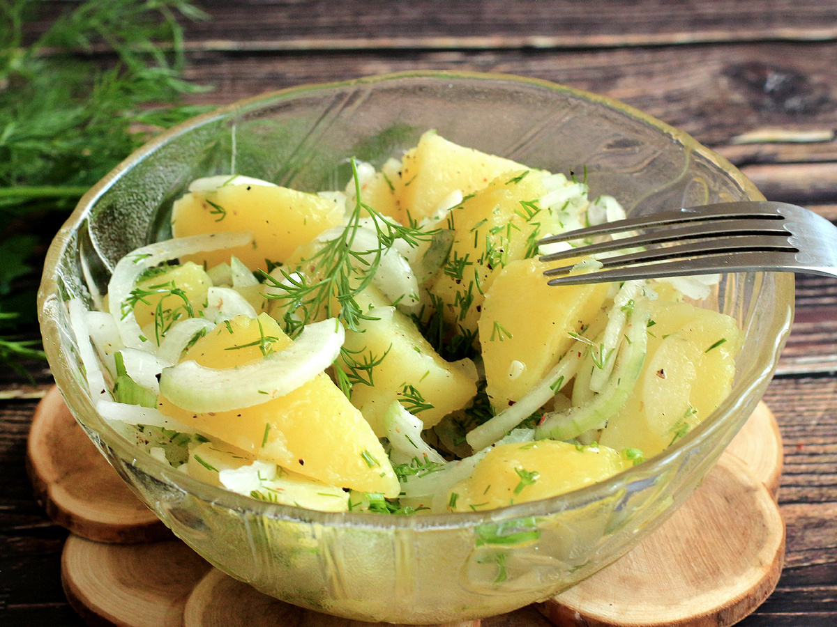 Этот картофельный салат станет отличным дополнением к мясным блюдам, а также может быть самостоятельным угощением для женщин. Благодаря этому рецепту можно легко создать легкий ужин, дополнив его малосольной рыбой для пикантности.