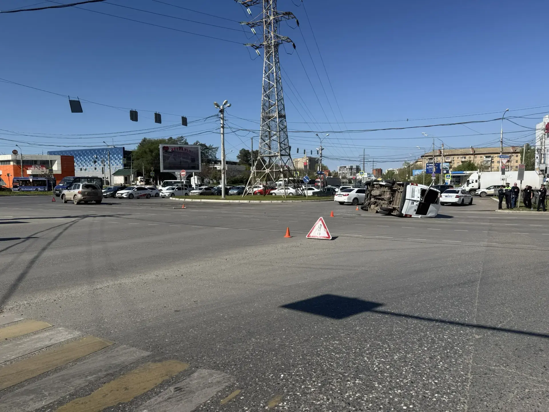 ДТП произошло на улице Вокзальной, 19. По предварительным данным УМВД, водитель маршрутного такси проехал перекрёсток на красный свет и столкнулся с автомобилем Hyundai Santa Fe. От удара маршрутка опрокинулась.